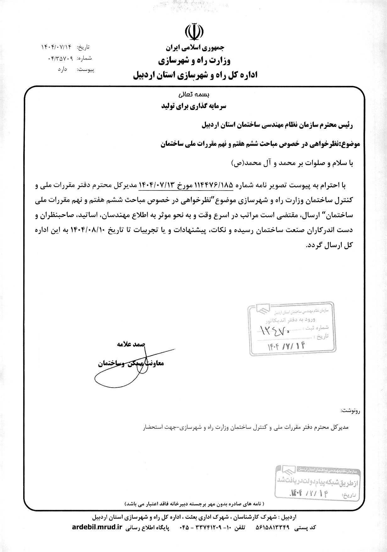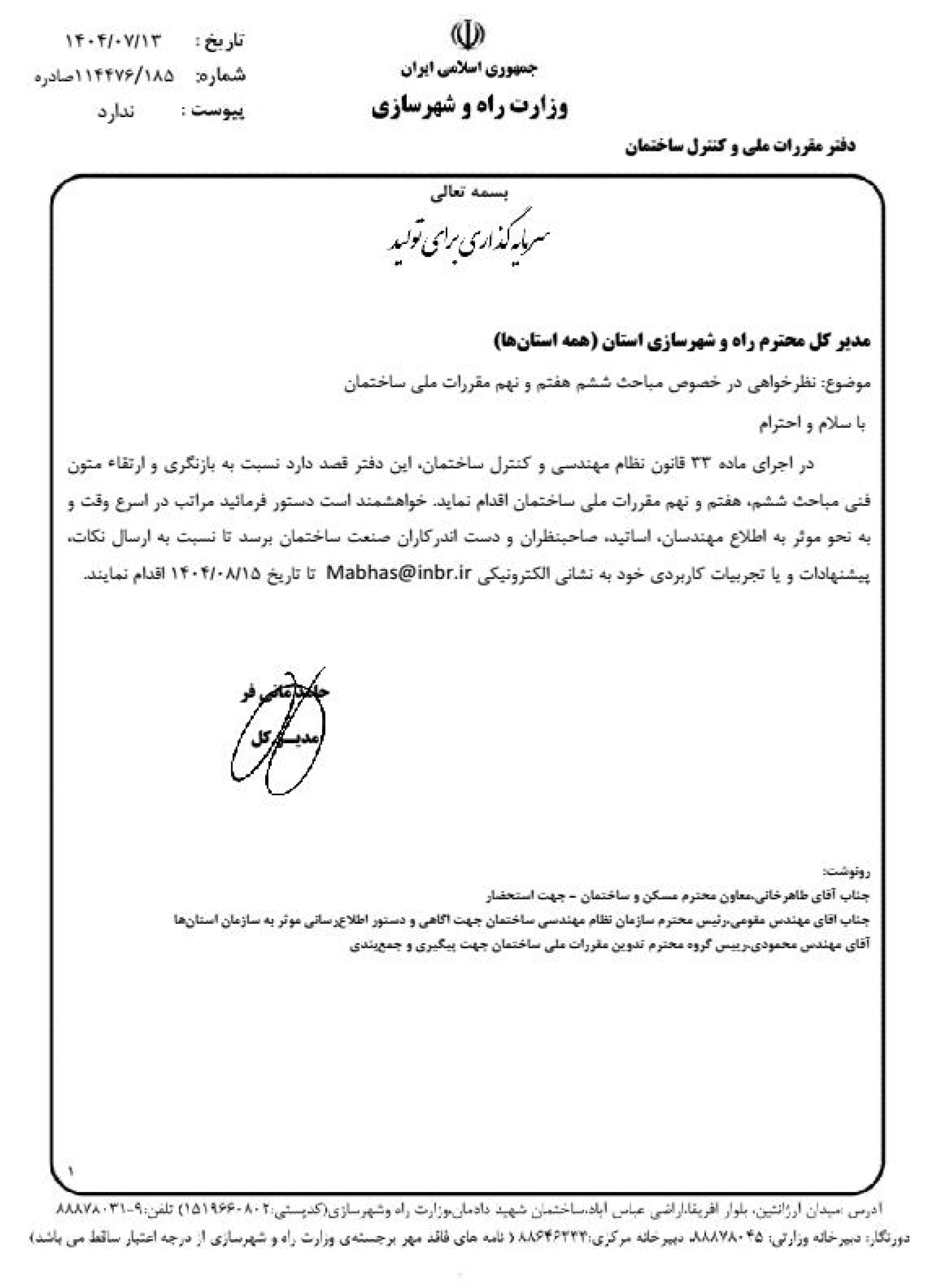 “نظرخواهی در خصوص مباحث ششم، هفتم ونهم مقررات ملی ساختمان”